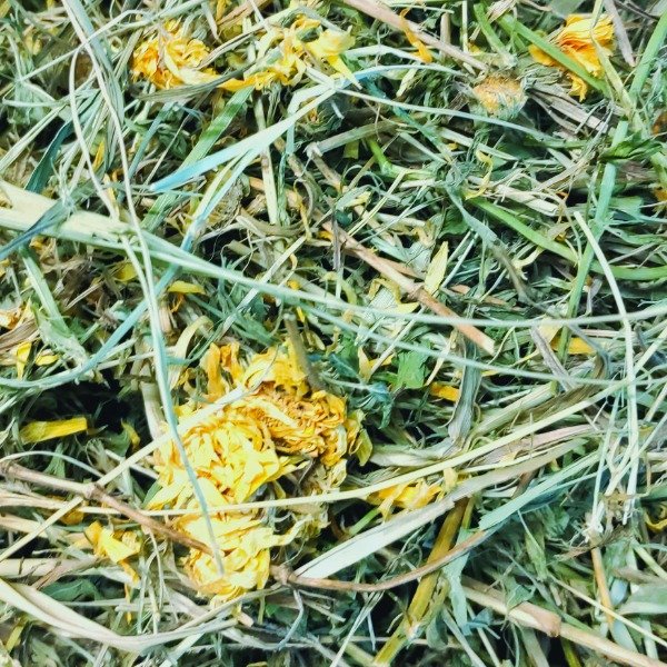 Hierbas y flores: Albahaca, margaritas, diente de león, manzanilla, alfalfa, tomillo, menta, laurel, heno de pasturas, rosa china,